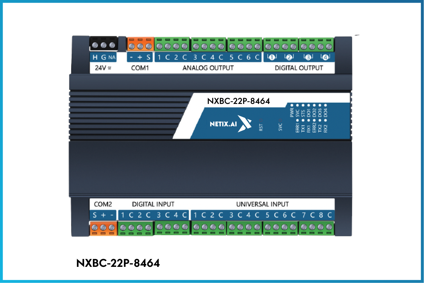 NXBC-16P-8044-D: An IP controller with an LCD screen, 16 base points (8UI, 4DO, 4AO), and 8 universal inputs (AI/DI). Ideal for fan units and temperature-humidity control systems, it supports configurable web functions and extension modules like NXM-B-0800 or NXM-B-6002. Additionally, it functions as a Modbus Master, Master Bridge, and Bacnet Router gateway for enhanced connectivity.