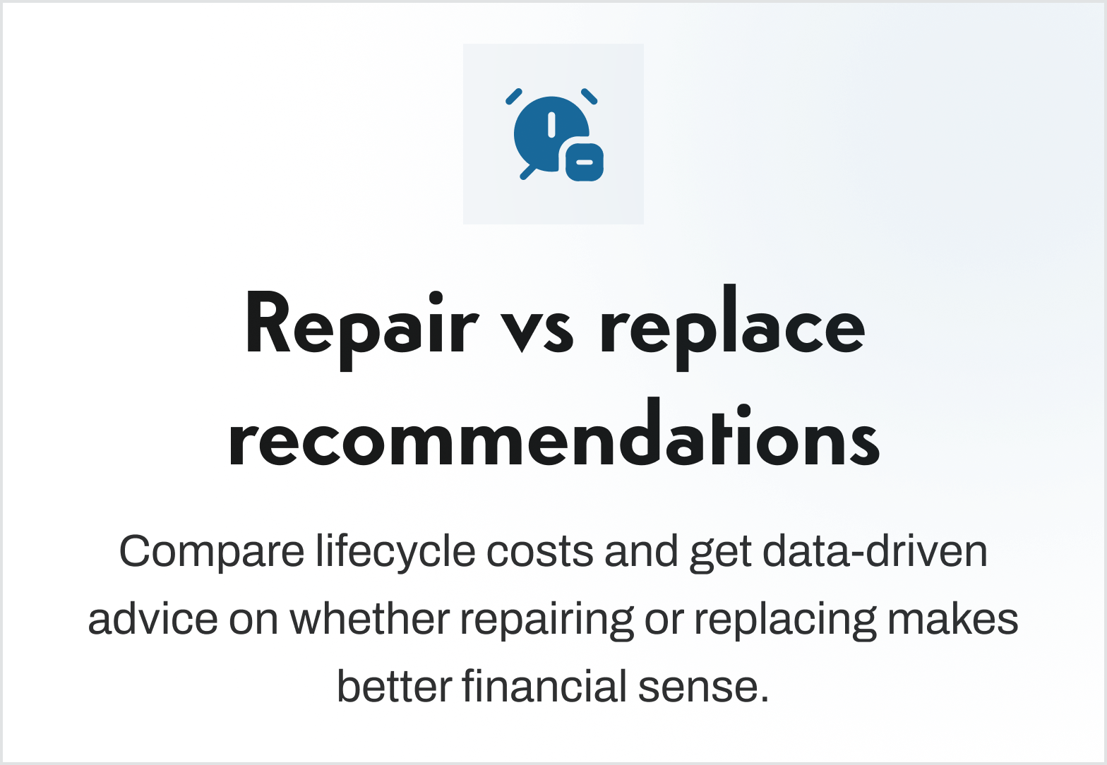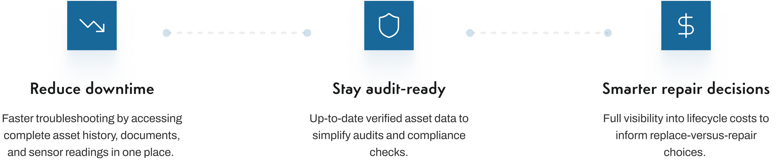 Centralize every asset detail in one system: maintenance history, sensor readings, documents, spare parts inventory and complete lifecycle financials. From QR scans to predictive insights, keep your facility data audit-ready and actionable.